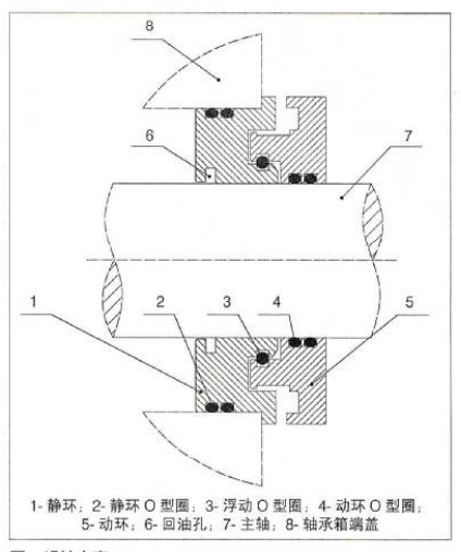 軸承箱隔離器是近十年出現的新型密封產品,是在復合迷宮密封的基礎上發展起來的一種非接觸密封形式。其機構由靜環、動環、浮動環組合而成,靜環阻止潤滑油泄漏并帶有回油孔,動環防止外界污染物進人軸承箱。浮動環連接動環與靜環,將其鎖定為一個整體,這個整體結構同時具有蒸汽阻隔作用。動環和靜環上使用的是O型圖密封,軸承隔離器是一種非接觸、無磨損的軸承保護裝置。當設備運行時,動靜環之間不接觸,所以沒有功率損耗,同時利用自身結構特點防止漏油。